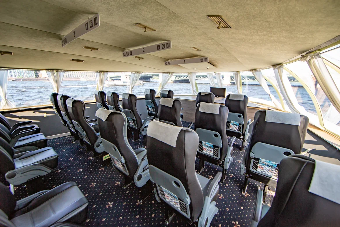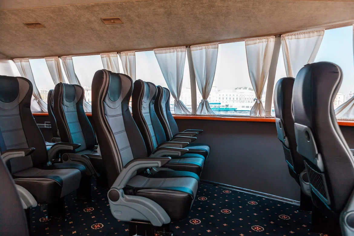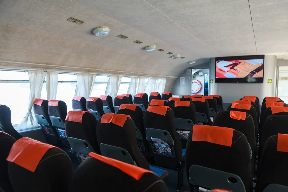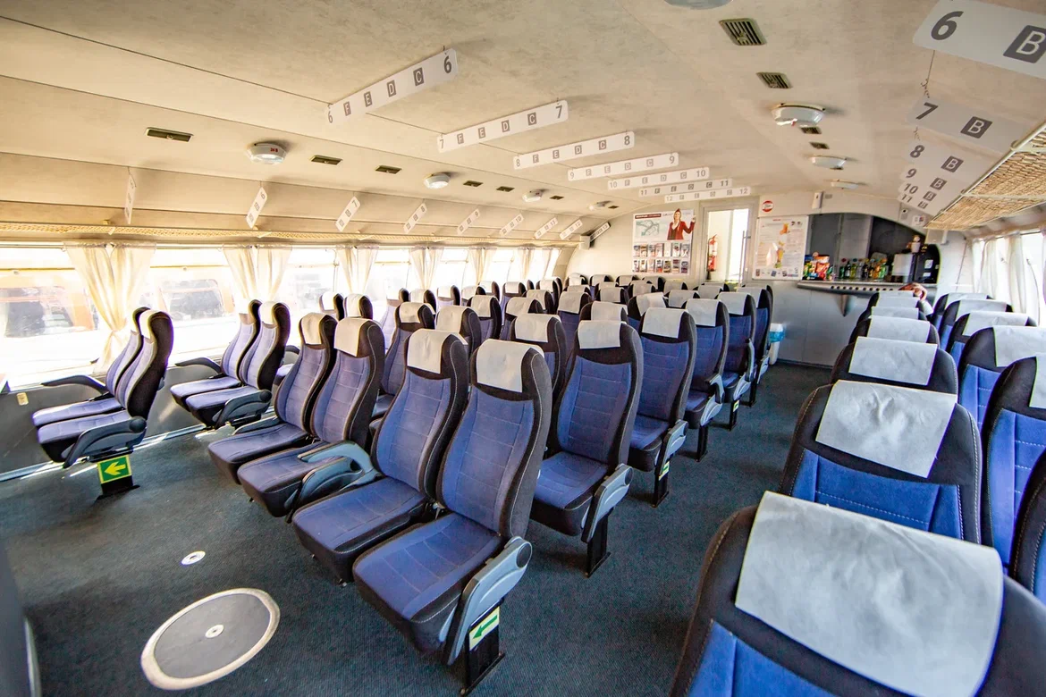 «Метеоры» вмещают до 120 пассажиров, обеспечивая комфортное размещение для всех. Широкие проходы между рядами позволяют свободно передвигаться по салону, а расстояние между мягкими креслами обеспечивает достаточное пространство для отдыха. Лучший обзор открывается с мест в носовой части салона.