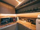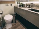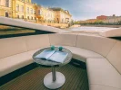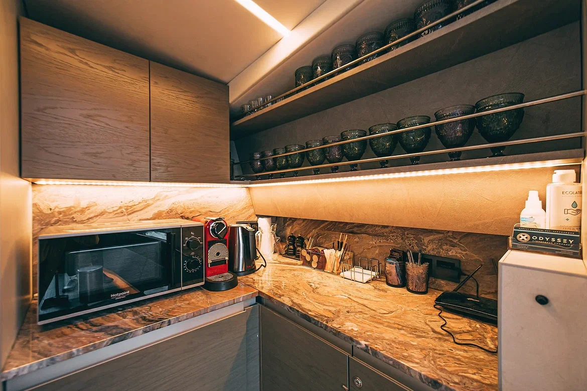 Интерьер каюты сдержанный и сбалансированный, с преобладанием светлых тонов в отделке. Стол и подоконники выполнены из натурального итальянского мрамора арабискато оробико. Благородный камень графитового и молочного оттенка органично дополняют прожилки изумрудного и песочного цветов.