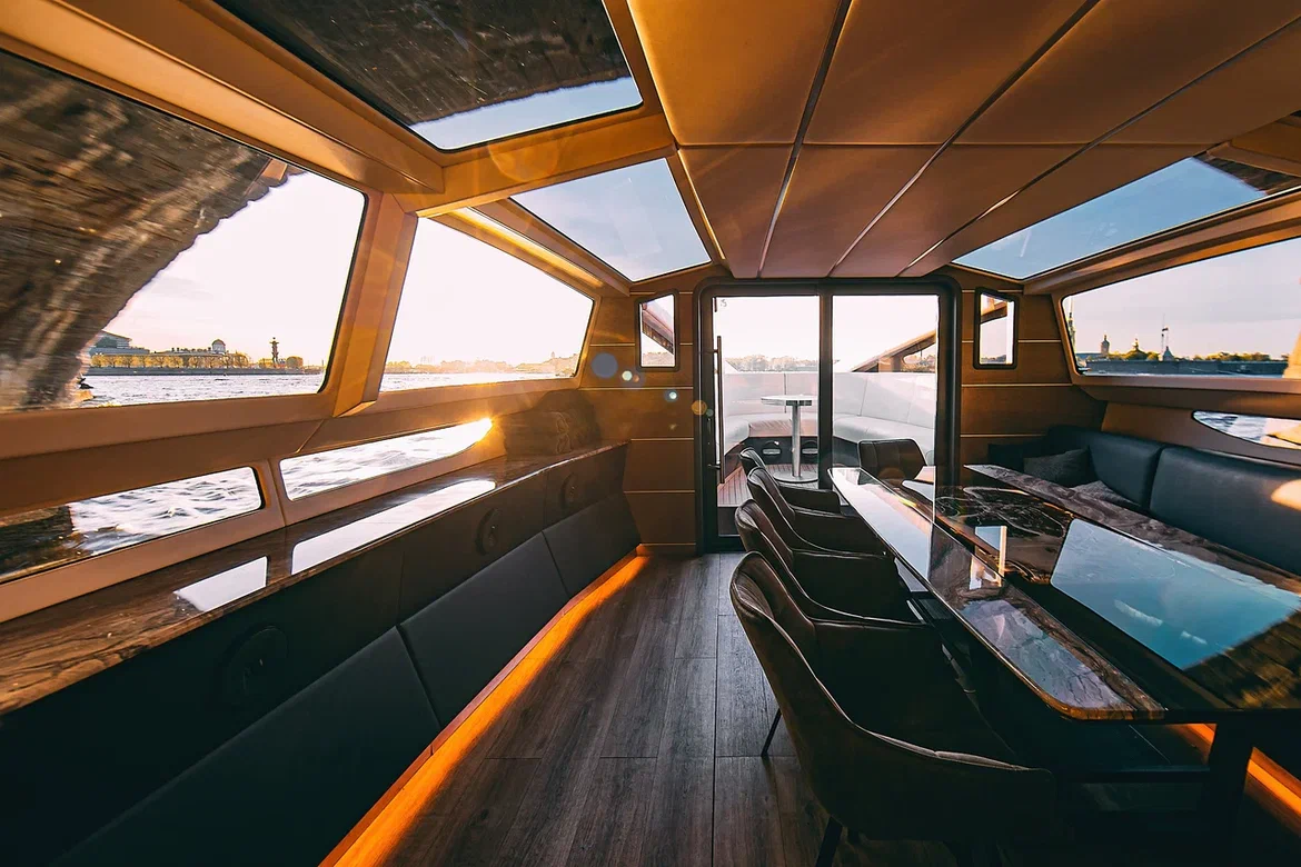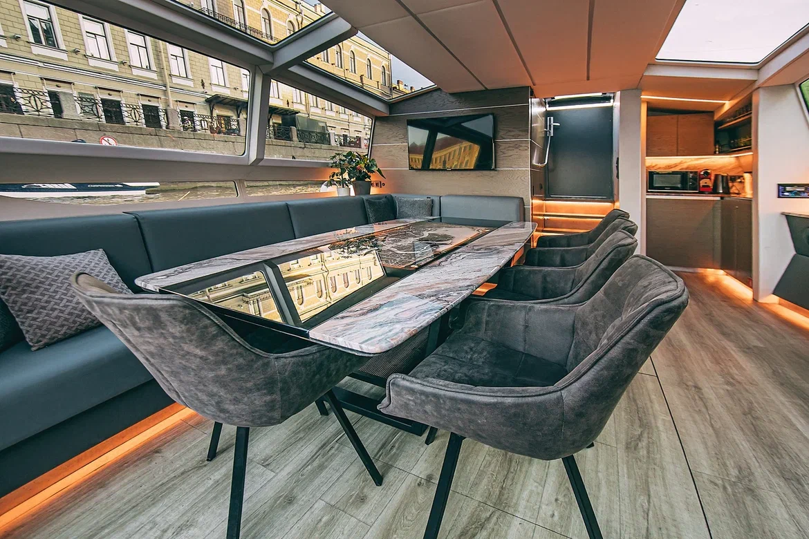 Одной из интересных интерьерных находок является стеклянная монохромная карта Петербурга с подсветкой, инкрустированная в мраморную столешницу, что позволяет увидеть, где судно проходит в данный момент.