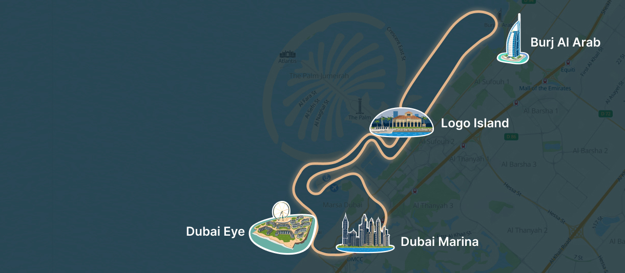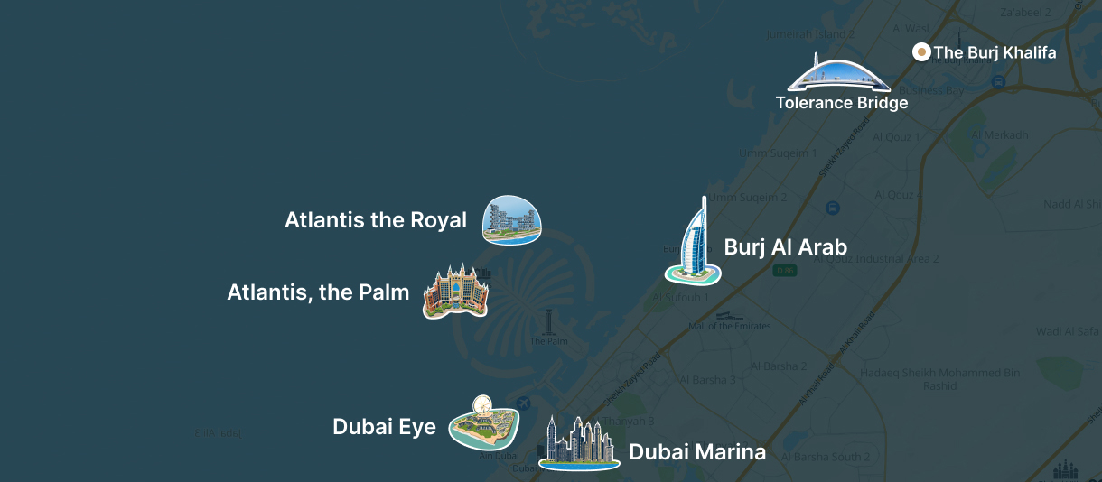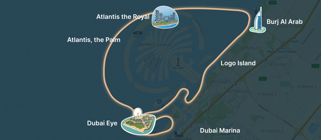 Dubai Marina - Bluewater Island - Dubai Eye - Jumeirah Beach Residence - Palm Jumeirah - Logo Islands  - Burj Al Arab