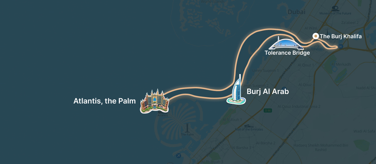 Business Bay Area - Burj Khalifa - Waterfall Bridge - Tolerance Bridge - Helix Bridge - Palm Jumeirah - Burj Al Arab - Atlantis